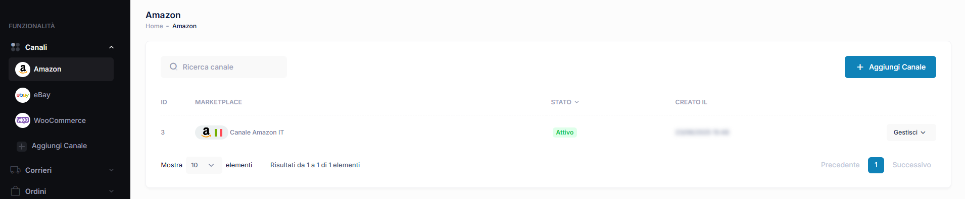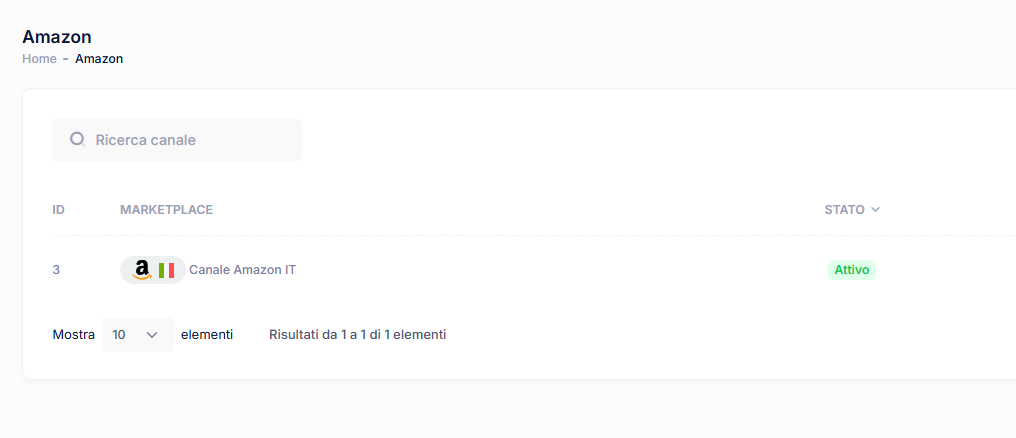 Se il collegamento è andato a buon fine allora vedrai, nella sezione Amazon, il canale regolarmente agganciato e nello stato Attivo. Dal pulsante gestisci potrai visualizzarne i dettagli ed eliminarlo.