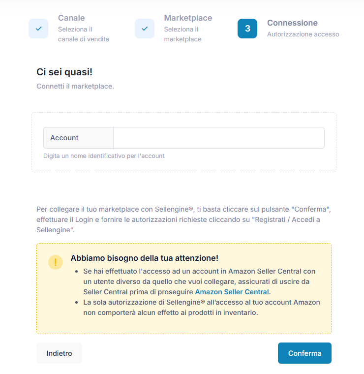 Dai un nome al connettore e completa il collegamento inserendo i tuoi dati di login Amazon e autorizzando l'app Sellengine sul Seller Central.